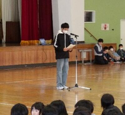 発表してくれたみなさん、ありがとうございました。6年1組のみなさんの発表では、桜を大切にしようという思いが伝わってきました。6年2組のみなさんの発表では、何個も活動をしているのがいいと思いました。6年3組のみなさんの発表では、中庭をきれいにしてくれたのでこれからも大切にしていきます。全校のみなさんも応援していただきありがとうございました。これからも、みんなの「好き」、「楽しい」、「なぜ」があふれる楽しい学校にしていきましょう。