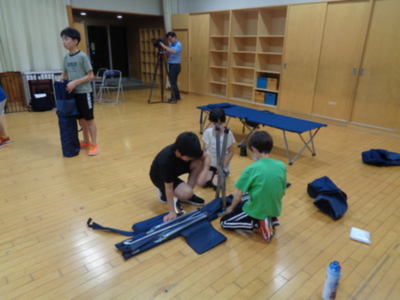 〇内容 非常用ご飯を食べたり、非常用簡易ベッドを組み立てたりして、学校に泊まる。