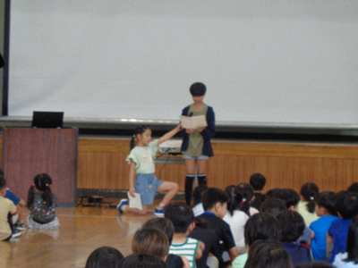 8月28日(木)朝、高森町より1年生に本を贈呈していただきました。町からの本の贈呈は、「出生時」、「園年少時」、そして今回が「小学校1年生時」の3回目となるため、サードブックと呼ばれています。壬生町長が来校され、代表児童に直接本を手渡してくださいました。