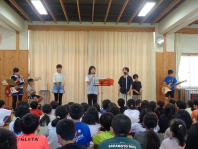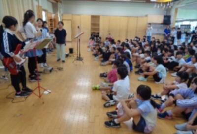 本年度、子どもたちの「やってみたい」を実現するために、子どもたちが考えた有志によるイベントやサークル活動に取り組んでいます。令和7年度重点目標を、子どもたちの自主的な活動を通して実現していきます。バンド「rainbow!!☆」のライブは、7月公演に続く2回目が10月8日(水)、10日(金)にありました。多くの子どもが声援を送る中、とても素敵な演奏をしてくれました。rainbow!!☆は、10月25日(土)に第43回高森ふるさと祭りにも出演しました。