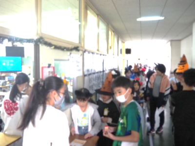 6年1組の有志でハロウィンのイベントを企画しました。全校で気軽に楽しめる「ハロウィン仮装パーティー」です。洋服は、家から着てきてもよいし、学校で着替えてもよく、帽子や眼鏡を身につけるだけの簡単なことでもよいこととしました。必ず仮装をしなければいけないというわけではありませんし、やりたい人がやります。全校にビンゴカードを配って、休み時間や昼休みに出会った人と話をしたらカードに丸を付け、ビンゴになったらスタンプをもらうという、全校の交流をしました。