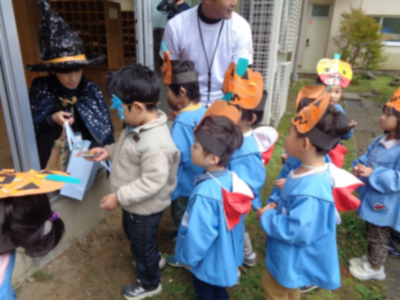 当日は下市田保育園の遠足の日でもあり、南小学校の中庭で休憩をしていってくれました。仮装をした園児の皆さんは、校長先生に「トリック・オア・トリート!」と言って、お菓子をもらっていましたよ。