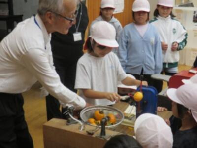 10月16日(木)・17日(金)には、時の駅で市田柿の歴史について、館長さんのお話をお聞きしました。江戸時代に焼き柿を「立石柿」という名称でつくっていた頃から、今の干した市田柿になる経緯を話してくださいました。手回しの柿むき機械も体験しました。