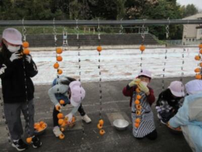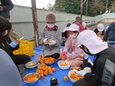 10月31日(金)は柿むき会でした。南信州農業農村支援センター、社会教育委員、地域ボランティア、そして保護者の皆様にご助言、お手伝いをいただきながら、ピーラーを使って皮をむき、柿をつるしました。寄付をしていただいたものも含めると柿の数は1300!慣れない作業に苦戦する姿もありましたが、とても楽しい時間を過ごせたようです。